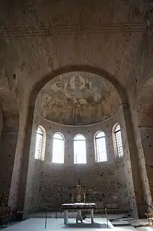 Major churches dating to this period include Hagia Eirene in Constantinople, which was rebuilt in the 760s following its destruction by the 740 earthquake. The interior of Hagia Eirene, which is dominated by a large mosaic cross in the apse, is one of the best-preserved examples of iconoclastic church decoration.[59] The church of Hagia Sophia in Thessaloniki was also rebuilt in the late 8th century.[60]