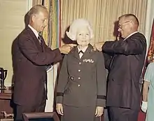 Secretary of the Army Robert F. Froehlke, assisted by Colonel Keith S. Lane, pins stars on the WAC Director, Mildred I. C. Bailey, August 2, 1971.
