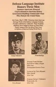 The Defense Language Institute at Presidio of Monterey dedicated Nisei Hall in honor of the Japanese Americans who served in the MIS, along with the individually named John Aiso Library and Munakata Hall (named for the former MISLS instructor Yutaka Munakata), and the Hachiya, Mizutari, and Nakamura Halls (named for Frank Hachiya, Yukitaka "Terry" Mizutari, and George Nakamura, who were killed in action in Leyte, New Guinea, and Luzon respectively).[36] Additionally, longtime civilian MISLS instructor Shigeya Kihara was inducted into the Defense Language Institute Hall of Fame in its inaugural year, 2006,[37] and MISLS graduates Col Thomas Sakamoto and Maj Masaji Gene Uratsu inducted the following year in 2007.[38]