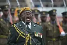 An officer of the Presidential Guard of Zimbabwe giving military commands during a parade.