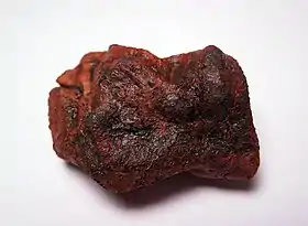 ![]() A 175 grams (6.2 oz) individual of the Millbillillie meteorite shower, a eucrite achondrite that fell in Western Australia in 1960. This specimen is approx. 6 centimetres (2.4 in) wide. Note the shiny black fusion crust with flow lines. The chip at lower right allows one to see the light-gray interior. The orange staining at top is a result of weathering, as these stones were not recovered until many years after they fell. | |