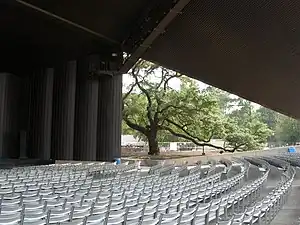Seating is provided for 1,705 patrons, with 20 wheel-chair spaces, plus an 80,000-square-foot (7,400 m2) sloping lawn that accommodates about 4,500 more.[2] The theater building itself consists of a 64' x 41' stage; 54 line sets for hanging lights, curtains, and scenery; an orchestra pit which can be raised and lowered; dressing rooms; offices; a full complement of theatrical equipment; and a 110-ton air conditioning system for cooling the performance area.[2] In its 2010 season, the Miller Outdoor Theatre provided entertainment for more than 430,000 people at 141 performances and events.[2]