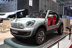 The Mini Crossover Concept was unveiled in 2008 at the Paris Motor Show.[24] It was over 4 metres (13 ft) long, with four-wheel drive, wide tyres, and a single piece rear door with a retractable rear window. Inside, it had a large glass ball in the centre of the instrument panel, called the 'Mini Centre Globe'; this system incorporated laser projection technology for 3D navigational routes and films. A production vehicle based on the Crossover Concept was launched in 2010 as the Mini Countryman.