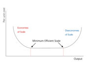 The concept of minimum efficient scale is useful in determining the likely market structure of a market. For instance, if the minimum efficient scale is small relative to the overall size of the market (demand for the good), there will be a large number of firms. The firms in this market will be likely to behave in a perfectly competitive manner due to the large number of competitors.[3] However, if the minimum efficient scale can only be achieved at a significantly high levels of output relative to the overall size of the market, the number of firms will be small, the market is likely to be a oligopoly or monopoly market.