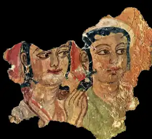 This Romanesque style is thought to be the work of a Buddhist painter known as "Titus" (𐨟𐨁𐨟, Tita), who signed his painting at Miran with his name in Indian Kharoshti characters, and who was perhaps a Roman artist who traveled east along the Silk Roads in search of employment.[9][10][11] Several artefacts have been found at the Miran site, including bows and arrows.[12]