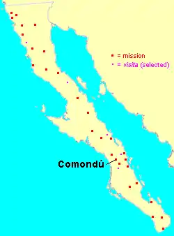 The new location for Comondú was located about 50 kilometers to the southwest, at what had previously been the visita of San Miguel. This location was reduced back to visita status in 1737, although many structural remnants of the mission survive.