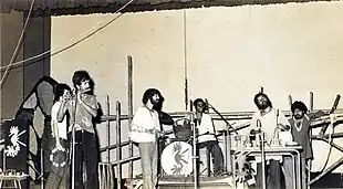 ![]() Moheener Ghoraguli in concert at Rabindra Sadan, 1979, left to right: Raja Banerjee, Pradip Chatterjee, Tapas Das, Pranab Sengupta, Gautam Chattopadhyay and Ranjon Ghoshal. Not shown also present were Abraham Mazumdar and Biswanath Bishu Chattopadhyay | |