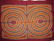 The Mola or Molas is a hand-made textile that forms part of the traditional women's clothing of the indigenous Guna people from Panamá. Their clothing includes a patterned wrapped skirt (saburet), a red and yellow headscarf (musue), arm and leg beads (wini), a gold nose ring (olasu) and earrings in addition to the mola blouse (dulemor).[1] Two groups, Choco and Cuna lived side by side without intermarriage and without adopting a similar culture.[2] In Dulegaya, the Guna's native language, "mola" means "shirt" or "clothing". The mola originated with the tradition of Guna women painting their bodies with geometric designs, using available natural colors; at a certain point, after the arrival of the Spanish, these same designs were woven in cotton, and later still, sewn using cloth "acquired by trade from the ships that came to barter for coconuts during the 19th century".[3][4]
