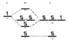 Hydrogen fluoride is another example of a heteronuclear molecule. It is slightly different in that the π orbital is non-bonding, as well as the 2s σ. From the hydrogen, its valence 1s electron interacts with the 2p electrons of fluorine. This molecule is diamagnetic and has a bond order of one.