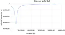 Potential energy in the Earth–Moon system. Because the Moon has higher potential energy, tethers can work together to pick an object off the Moon (the tiny dimple on the right), and place it closer to the Earth in LEO, taking essentially no propellant and even generating energy while doing so.