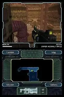 Moon features first-person shooter gameplay and full 3D environments that the player can explore. Over the course of the game, the player can collect a variety of weapons to fight enemies. The game has three difficulty modes and is presented in multiple episodes with checkpoints scattered throughout each one. The upper screen of the DS displays the player's view of the environment, while the lower screen displays menu commands and a real-time map.[5] The game's story will be revealed as the player progresses through each level with pre-rendered cutscenes, text logs accessible through computer terminals, and communications with the player character's superiors. Much of the fighting the player experiences takes place in narrow corridors, although the developer has mentioned that the updated game engine allows for wide-open environments and large groups of enemies. The game does not feature any multiplayer mode, with the focus of the game being the single-player campaign.[2]