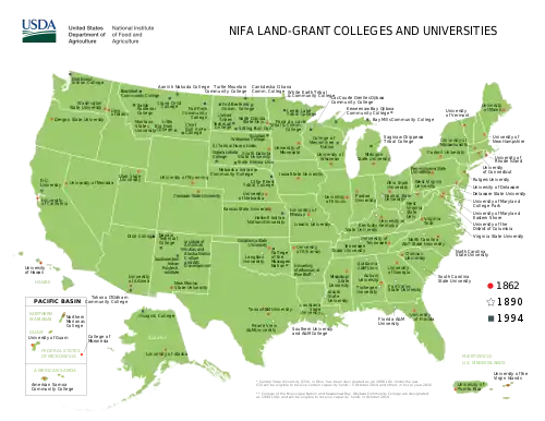 The Morrill Land-Grant Acts are United States statutes that allowed for the creation of land-grant colleges in U.S. states using the proceeds from sales of federally owned land, often obtained from Native American tribes through treaty, cession, or seizure. The Morrill Act of 1862 (12 Stat. 503 (1862)[1] later codified as 7 U.S.C. § 301 et seq.) was enacted during the American Civil War, and the Morrill Act of 1890 (the Agricultural College Act of 1890 (26 Stat. 417, later codified as 7 U.S.C. § 321 et seq.)) expanded this model.
