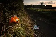 Aftermath of a motorcycle accident. A wrapper from a defibrilation system and some flowers. - There is also a condition known as biker's arm, where the nerves in the upper arm are damaged during the fall, causing a permanent paralysis of arm movement.