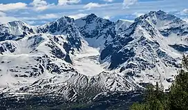 The climate of the Chugach Mountains is strongly influenced by its location close to Prince William Sound and especially the Gulf of Alaska. The Gulf of Alaska generates powerful winter storms which drive heavy precipitation northwards into southern and Southcentral Alaska, including the Chugach Mountains.[9] More snow falls in the vicinity of Valdez—an average annual snowfall of 279 inches (709 cm)—than in any other location in the United States.[10] Over thousands of years, this snow has accumulated to form glaciers on Mount Billy Mitchell, especially on its north face, which is its leeward side. Despite this long-term glaciation and even in the face of continuing heavy snowfall (the winter of 2011-2012 saw record snowfall in this area),[11] the rate of ablation has exceeded the rate of accumulation over the past few decades. Because of this, Mount Billy Mitchell's glaciers have retreated significantly in recent years.[12][13]