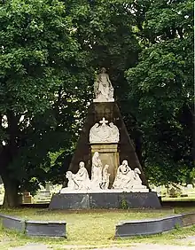 In 1864, the Gardel Memorial was added to Mount Vernon. It is a memorial to Julia Hawks Gardel, the principal of a female seminary in Philadelphia,[4] who died in 1859 while traveling in Syria.[5] Her husband, Bertrand Gardel, commissioned Belgian sculptor Guillaume Geefs to create a 25-foot pyramid made of sandstone, marble and imported granite. The front of the pyramid is adorned with large marble statues which represent the continents of Asia, Europe and Africa to depict Julia's love of travel. Two statues above the pyramid door depict Hope and Faith holding a carved relief of Julia. The statue atop the pyramid represents America surrounded by emblems of the physical sciences. The memorial cost $36,000 which is the equivalent of about $2 million in current dollars. Bertrand Gardel died in 1895 and is interred in the vault beneath the memorial with his wife.[6]