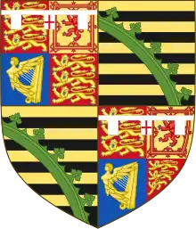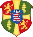 ![]() Blazon: Quarterly, 1st and 4th: Azure, a Lion rampant double-queued Barry of ten Argent and Gules and ducaly crowned Or, within a Bordure compony of the second and third (Hesse); 2nd and 3rd: Argent, two pallets Sable (Battenberg). | |