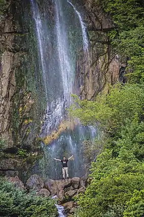 Mukhura Waterfall Natural Monument (Georgian: მუხურას ჩანჩქერის ბუნების ძეგლი) is a waterfall with a height of 60-70 m at 882 m above sea level in Tkibuli Municipality, Imereti region of Georgia.[2] [1] Water flows from the cave located on the slope of eastern exposure and forms a three step waterfall. Inside the cave there is one small and one big lake. There also flows of a pristine river inside the cave, which locals refer to as Tskalmechkheri (shallow water). The banks of the waterfall are covered in mixed broadleaf forest. The place is home to many endemic species, such as Caucasian mole, Volnukhin and Caucasian water shrew. Ten different kinds of bats live in the cave.