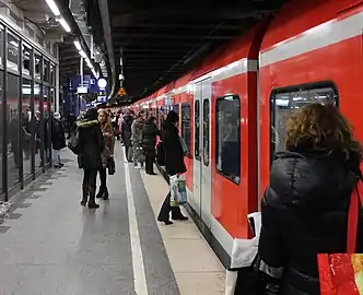 The third level holds the S-Bahn station with two tracks and three platforms, arranged in the Spanish solution: The island platform is for boarding only and the side platforms are for disembarking. The lines , , , , , and call at this station.