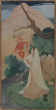 Still another tale states that on one occasion, Parvati's used bath-water was thrown into the Ganges, and this water was drunk by the elephant-headed goddess Malini, who gave birth to a baby with four arms and five elephant heads. The river goddess Ganga claimed him as her son, but Shiva declared him to be Parvati's son, reduced his five heads to one and enthroned him as the controller of obstacles (Vignesha).[19]