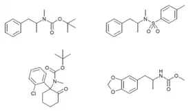 - ↑ Collins M, Donnelly C, Cameron S, Tahtouh M, Salouros H (March 2017). "Identification and characterization of N-tert-butoxycarbonyl-MDMA: a new MDMA precursor". Drug Testing and Analysis. 9 (3): 399–404. doi:10.1002/dta.2059. PMID 27574107.