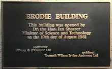 The institute was the first multi-disciplinary marine sciences organisation to be formed outside the United States and Britain. Brodie initially found rooms in chilly Victorian offices above a dress shop at the parliament end of Lambton Quay. It wasn't until 25 years later in 1980 that NZOI moved into new purpose-built laboratories at Greta Point. This was 3 years after Jim Brodie had had to retire aged 57 because he had completed 40 years in the civil service. The building was named after him. The Brodie Building was one of a pair of buildings designed by Toomath Wilson Irvine Anderson Ltd. The institute library held vital expedition reports, some dating back to the 1800s, which continue to be a major asset to research on New Zealand's flora and fauna.[3]