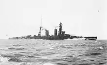 Upon commissioning, the sister ships were assigned to the 1st Battleship Division, although Nagato became the flagship of Rear Admiral Sōjirō Tochinai, a role she often fulfilled during her career. The ships hosted Edward, Prince of Wales, and his aide-de-camp Lieutenant Louis Mountbatten in 1922 during the prince's visit to Japan.[13] After the 1923 Great Kantō earthquake, both ships loaded supplies from Kyushu for the victims on 4 September. They sank the hulk of the obsolete battleship Satsuma on 7 September 1924 during gunnery practice in Tokyo Bay in accordance with the Washington Naval Treaty. Nagato became flagship of the Combined Fleet on 1 December 1925, flying the flag of Admiral Keisuke Okada. The sisters were placed in reserve several times during the 1920s while they were being modernized. Mutsu served as flagship of Emperor Hirohito during the 1927 naval maneuvers and fleet review and again in 1933.[13][51]