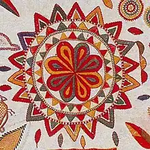 The colourful patterns and designs that are embroidered resulted in the name "Nakshi Kantha",[6] which was derived from the Bengali word "naksha", which refers to artistic patterns.[7] The early kanthas had a white background accented with red, blue and black embroidery; later yellow, green, pink and other colours were also included. The running stitch called "kantha stitch" is the main stitch used for the purpose.[8] Traditionally, kantha was produced for the use of the family. Today, after the revival of the nakshi kantha, they are produced commercially.[9]
