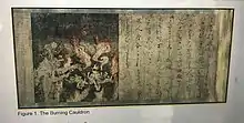 ![]() Currently held in the Museum of Fine Arts in Boston, this Japanese scroll is illustrated in the style of Jigoku Zoshi. Originally drawn during the Heian period in the 12th century depicting the 8 great hells and the 16 lesser hells in both text and painting. The specific fragment of the scroll being shown shows a demon stirring a heated cauldron full of people in the Hell of the Single Copper Cauldron. |