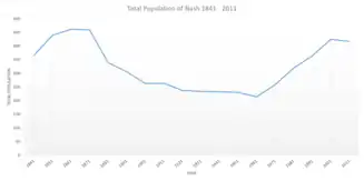 The most recent, 2011, census of the UK put the total population of Nash at 417.[1] The population has grown sharply since the lowest recorded population total of 214, which was found in the 1961 census.[12] The population previously went through a long period of decline between 1871 (when the highest total population of 460 was recorded) and 1961.[13]