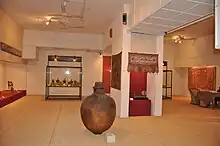 Various galleries within the museum include the Tribal and Rural Craft Gallery, Gallery of Courtly Crafts, Textile Gallery, and Gallery of Popular Culture.[9] Some of its prized collection include, the 250-300-year-old, Bhoota Collection from Karnataka, rare Kashmiri 300-year-old ‘dushalas’, handkerchiefs from Chamba, known for their unique embroidery, rare brocade and Baluchari saris, Kutch embroidery, precious metal jewellery and much more. The museum is popular for an exhaustive collection of textiles.[10] The museum also houses a village complex spread over 5-acre (20,000 m2), with 15 structures representing village dwellings, courtyards and shrines from different states of India, with items of day-to-day life displayed. The entire village complex is a remnant of a temporary exhibition on the theme of rural India, held in 1972. Today several traditional craftsmen in residence at the museum, can be seen working in a designated area within the museum complex, who also sell the crafts they create.