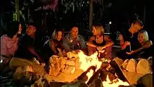S Club sitting around the campfire at the end of the music video. (Left - Right) Barrett, McIntosh, Stevens, Cattermole, Spearritt, Lee and O'Meara.