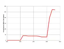 In 2000, a modest discovery was made when a 33-billion-cubic-metre (BCM), or 1,200-billion-cubic-foot, natural-gas field was located offshore Ashkelon, with commercial production starting in 2004. As of 2014 however, this field is nearly depleted—earlier than expected due to increased pumping to partially compensate for the loss of imported Egyptian gas in the wake of unrest associated with the fall of the Mubarak regime in 2011. In 2009, a significant gas find named Tamar, with proven reserves of 223 BCM or 7.9×1012 cu ft (307 BCM total proven + probable) was located in deep water approximately 90 km (60 mi) west of Haifa, as well as a smaller 15 BCM (530×109 cu ft) field situated nearer the coastline.[15][16][17][18] Furthermore, results of 3D seismic surveys and test drilling conducted since 2010 have confirmed that an estimated 621 BCM (21.9×1012 cu ft) natural-gas deposit exists in a large underwater geological formation nearby the large gas field already discovered in 2009.[19][20][21][22] The US Energy Information Administration listed Israel as having 6.2 trillion cubic feet of proved reserves as of 1 January 2015.[23]