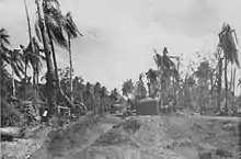 On 21 July 1944, 621 men and 23 Officers landed under fire on Guam, with the 3rd Marine Division.[1][4][5] The Division had three shore parties one for each regiment. 25 NCB had I Co. posted to the 3rd Marine Regiment, G Co. to the 9th Marines and H Co. to the 21st Marines. Each shore party was made up of one Pioneer Company and one Seabee company.[1] Commander Whelan was Shore party Commander for the 3rd marine Regiment on Beaches Red 1 and Red 2. During the assault phase the entire 19th Marines were assigned to combat teams.[6] The 25th's Lt.Cmdr. Whelan was shore party commander for the 3rd Marine Regiment on beaches Red 1 and Red 2.[7] He received the bronze star for his leadership of the shore party as did Lt Cdr. Brett W. Walker for the same reason on beaches Blue and Green. The jungle conditions were such that bulldozers were required for everything. Roads had to be grubbed to get supplies to the front, the wounded evacuated, and the artillery em-placed. There were numerous times the Seabees were working in front of the lines in order for the lines to advance and lost men doing that. Dozers were needed so badly that those organic to the artillery units had to be reassigned until they were not required. The Seabees brought with an organic element the Marines did not have i.e. bulldozers with winches and D8s 132–148 Hp compared to the Marine's TD 18s 72–80 Hp. Afterwards the Marines assessment was that: "in all future amphibious operations a Seabee component or one with equal road building capabilities be assigned to the assault". It was not until 20 September that that entire Battalion was completely on Guam. One of the Battalions projects was Harmon Airfield.
