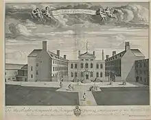 Based at Deptford for most of the sixteenth century, the Navy Office later moved to the Tower Hill area of London.[1] In 1655 it relocated to a site at the crossroad of Crutched Friars and Seething Lane but in 1673 the office building was destroyed by fire. A new building designed by Christopher Wren was opened on the site in 1684.[2] The Navy Office continued to be based in Tower Hill until its move in 1786 to Somerset House.