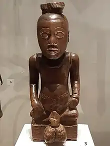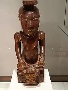 The durable hardwood and the palm oil anointments underscore the longevity of these works, the earliest examples of which, such as the ndop in the Brooklyn Museum’s collection, are among the oldest surviving wood works from the continent. Three wooden ndop figures from the Kuba kingdom currently reside in the British Museum. Collected by the Hungarian explorer Emil Torday, one of them is estimated to date back to the eighteenth century, making it one of the oldest wooden sculptures extant from Sub-Saharan Africa.[4] Two similar figures are in the Royal Museum for Central Africa in Belgium.[5][6]