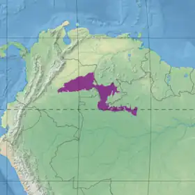 The ecoregion has an area of 21,289,702 hectares (52,608,000 acres)[1] It overlays the Casiquiare Rift.[2] The center of the ecoregion is in the extreme south of Venezuela, and covers part of the Parima Tapirapecó National Park. It extends west into Colombia, where it includes the south of El Tuparro National Natural Park, and extends to the southeast into the Brazilian states of Amazonas and Roraima, including part of the Pico da Neblina National Park.[1] It adjoins the Caquetá and Japurá–Solimões–Negro moist forests to the south, the Llanos grasslands to the north, the Guianan piedmont and lowland moist forests to the east and the Uatuma–Trombetas moist forests to the southeast. It also adjoins or contains areas of Rio Negro campinarana.[3]