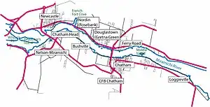 Located on S side of the Miramichi River, 3.71 km S of Chatham Head: Nelson Parish and Chatham Parish, Northumberland County: PO Nelson 1842-1868: in 1871 Nelson had a population of 600: in 1898 Nelson was a station on the Canada Eastern Railway and a farming, lumbering and fishing community with 8 stores, 1 hotel, 2 sawmills, 1 tannery, 1 carding mill, 1 barrel parts factory, 1 brick kiln, 3 churches and a population of 600: included the settlement of South Nelson: PO 1853-1968: in 1866 South Nelson was a farming and lumbering community with 33 resident families: included the community of South Nelson Road: PO South Nelson Road 1883-1947: PO Nelson-Miramichi from 1968: included the community of Nowlanville, located 8 km SE of Newcastle, where Patrick Nowlan, James Nowlan and Michael Nowlan were early settlers.