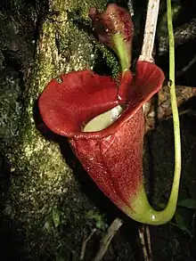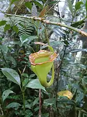 Upper pitchers are much larger, growing up to 15 cm high and 10 cm wide. Wings are reduced to ribs that run down the front of the pitcher. The greatly expanded peristome may reach 3.5 cm in width in aerial pitchers. The lid does not cover the mouth completely, being narrowly ovate. It is up to 5 cm long and 2 cm wide. The crater-like glands on the underside of the lid may be up to 1.5 mm wide. These glands are so large that they are visible as swellings on the upper surface of the lid. The spur is simple and up to 1 cm long. Pitchers range in colour from light green to dark purple throughout and may be lightly speckled. The most common form of this species has green pitchers with a red peristome.[1]