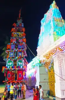 There are many temples in the village, which have been renovated recently. Chief among them are temples dedicated to Shiva, Anjaneya, Renuka Yellamma Devi, Aggu Muneshwara and Basaveshwara. There is an annual rathotsava(theru) held in the season of March/April, where a multi layered wooden chariot is pulled by devotees through the village thoroughfares. The chariot procession starts from the Shiva (Kashi VIshwanatha) temple (Eeshwarana Gudi) and guides its way to the Yellamma Devi temple in the center of the village. The occasion is marked with religious fervor and gaiety. The chariot procession is the highlight of the festivities which last for over a week.