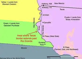 | The boundary line between New Mexico and Texas is the middle of the channel of the Rio Grande as it was located in 1850. | |