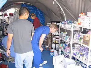 The New Waveland Clinic was a temporary emergency clinic set up by Brad "Baruch" Stone on August 28, 2005 and housed in tents.[12][13][14][15] Stone used his skills as an emergency medical technician (EMT) and previous experiences as a volunteer coordinator at the CALM Medical Clinic in order to build and administrate the clinic. The clinic recruited volunteer doctors, Physician Assistants, medical students, nurses, pharmacists, EMTs, and paramedics from different parts of the United States to volunteer for a week at a time. Medications and medical tools were donated by dozens of organizations including Pfizer, which donated the majority of the medications used. During its three months of operation, the clinic had over 5,500 documented patient encounters.