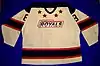 The Royals redesigned their logo when the franchise shifted from Cornwall to Newmarket, but kept the same uniform colours of royal blue, white and red. The new logo was a horizontal hockey stick with the words Newmarket Royals below it. Pictured are the home and away jerseys of # 8 Aaron Brand, that the team wore in their two seasons in the OHL.