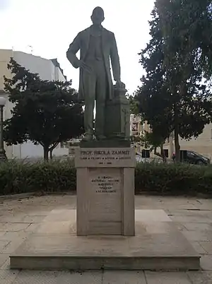 In matters of religion, Zammit could not have become more conventional. In Ai Funerali di Pio IX ("For the Funeral of Pius IX"; 1878)[41] he excused the pope for his failures. Moreover, when it came to religion Zammit seems to have chosen of take a within-the-walls stance, preferring now to look too much to the philosophical possibility that opposing views might have a point after all. In 1883, at his home-town, Siggiewi, Zammit founded the St. Nicholas Philharmonic Society.[42]