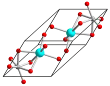 Nickel(II) titanate crystallizes at 600 °C[2] and is stable at room temperature and normal pressure in an ilmenite structure with rhombohedral R3 symmetry.[3] Nickel(II) titanate's rhombohedral structure has layers of Ni and Ti alternate along the rhombohedral axis with O layers between them. The XRD data supports nickel(II) titanate's ilmenite structure with its rhombohedral symmetry.[2] Other descriptions of nickel(II) titanite's Illemite structure consists of a pseudo close packed hexagonal array of O2− ions with two thirds occupied by an ordered hexagonal like cation.[4] The Average crystallites size for nickel(II) titanate was estimated at 42 nm with lattice constants of a = 5.032 Å, b = 5.032 Å, c = 4.753 Å.[4] The structure was established by using X-ray power intensities.[3]