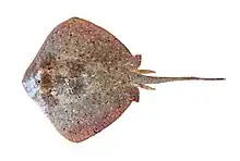 The Ningaloo maskray (Neotrygon ningalooensis) is a species of stingray in the family Dasyatidae, found along the northwestern coast of Australia. Measuring up to 30 cm (12 in) across, it has a diamond-shaped pectoral fin disc with a blunt snout and rounded outer corners. Its tail is whip-like with both upper and lower fin folds. This species has a distinctive dorsal color pattern consisting of numerous small, sharp-edged deep orange spots and slightly larger, fuzzy-edged pale blue spots on a yellowish brown background.