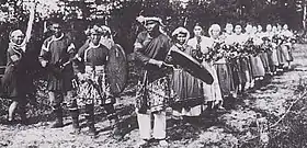 Nivkh Shamans also presided over the Bear Festival, a traditional holiday celebrated between January and February depending on the clan. Bears were captured and raised in a corral for several years by local women, who treated the bear like a child.[51] The bear was considered a sacred earthly manifestation of Nivkh ancestors and the gods in bear form (see Bear worship). During the festival, the bear would be dressed in a specially-made ceremonial costume. It would be offered a banquet to take back to the realm of gods to show benevolence upon the clans.[46] After the banquet, the bear would be sacrificed and eaten in an elaborate religious ceremony. Dogs were often sacrificed as well. The bear's spirit returned to the gods of the mountain 'happy' and would then reward the Nivkh with bountiful forests.[52] The festival typically would be arranged by relatives to honour the death of a kinsman. Generally, the Bear Festival was an inter-clan ceremony where a clan of wife-takers restored ties with a clan of wife-givers upon the broken link of the kinsman's death.[53] The Bear Festival was suppressed during Soviet occupation though the festival has had a modest revival since the decline of Soviet Union, albeit as a cultural instead of religious ceremony.[54]
