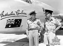 The flight received its first aircraft, the Canberra bomber A84-307, on 15 June 1953.[1] This aircraft had been built in Britain as the RAAF's first Canberra, and was flown to Australia by Wing Commander Cuming in July 1951. The journey had been completed in 21 hours and 41 minutes, setting an unofficial record for the route.[5] The flight's second aircraft, A84-201, arrived on 1 July.[1] This was the first Australian-built Canberra and was assigned to No. 1 Long Range Flight shortly after being completed. The second Australian-built Canberra, A84-202, was also assigned to the flight in August.[5] All three aircraft were modified for their specialised role by No. 1 Aircraft Depot. These modifications included fitting distance-measuring equipment in each of the aircraft and three fuel tanks in their bomb bays.[1][5] Wing Commander Cuming told journalists in August that the Australian-made Canberras were preferred to the British models on the grounds of national prestige and because the aircraft were fitted with superior navigation equipment.[6] A84-307 was retained by the flight, however, as the reserve aircraft to be used if modifications to A84-202 were not completed in time for the race.[5]