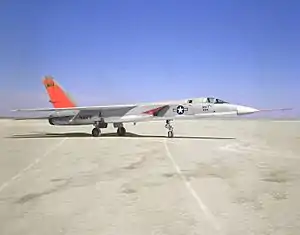 This proposal, which was referred to the North American General Purpose Attack Weapon (NAGPAW) concept, was promptly evaluated by the United States Navy.[5] The service produced numerous challenging demands, including the somewhat contradictory necessity of both a high speed of Mach 2 and the ability to take off from an aircraft carrier at maximum weight with no head-wind, also known as wind-over-the-deck, to assist the take-off. Compton's team were able to reconcile these performance requirements into the design.[5] Following these changes, US Navy officials voiced their approval of the design and advocated for its procurement.[7] During July 1955, an initial design contract, which included the production of a mockup, was issued to NAA. During September 1956, a follow-on contract for the production of a pair of flight-worthy prototypes, was awarded to the firm.[5]