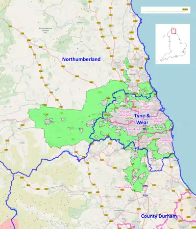 The belt's area is 71,854 hectares (718.54 km2; 277.43 sq mi), 0.6% of the total land area of England (2010).[8] The belt is on the fringes of the Tyne & Wear conurbations, with a line of belt separating South Tyneside from Sunderland. The main coverage of the belt however, is within southern Northumberland, with tracts in northern County Durham, notably surrounding the city of Durham completely.