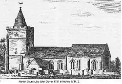 The church seen today was built in the early 14th century, although it was heavily restored around 1841.[9] The tower formerly had a small spire, but this was dismantled in 1890 as it had become unsafe.[8] The tower had also originally contained 3 bells: 1640 and the other two in 1663. One, however, was recast in 1849.[8] The tower's clock was made by Samuel Deacon's company in Barton in the Beans. It was installed on 1 September 1840, having cost £80.[8] The church vesty was built in 1850 and cost £100 to construct.[8]